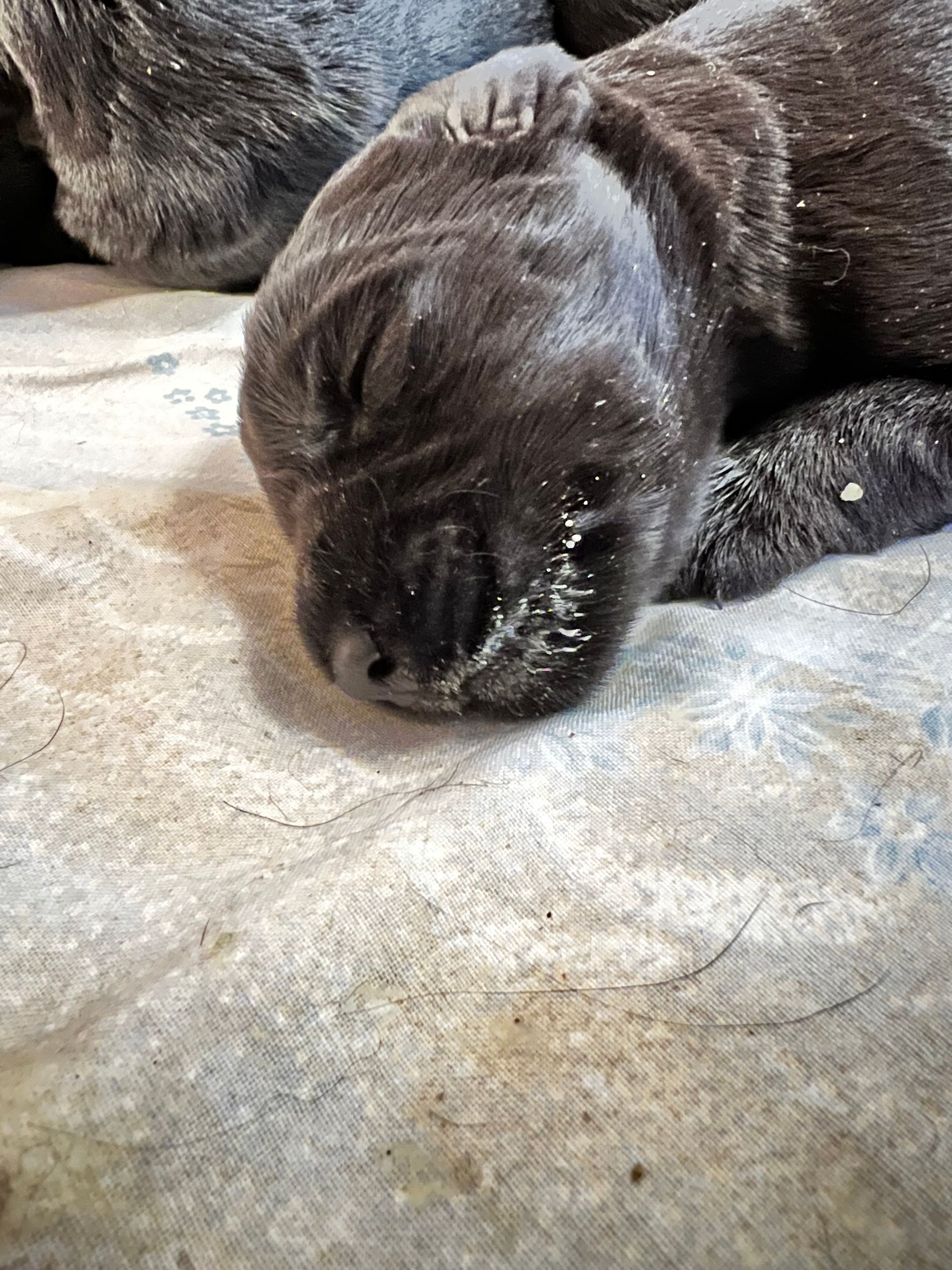 Negra kümmert sich sehr sorgfältig um die Kleinen und hat sogar etwas Milch bekommen! Sie ist mir eine so große Hilfe, da sie das Lecken und Putzen komplett übernommen hat. Für mich hieß/heißt es, alle 2 Stunden Milch geben. Aber es klappt alles wirklich gut und seit gestern bin ich auch was Trea´s Gesundung angeht sehr zuversichtlich. Die Babys haben alle ihr Geburtsgewicht verdoppelt, haben die Äuglein auf und fangen an wackelig "zu laufen".