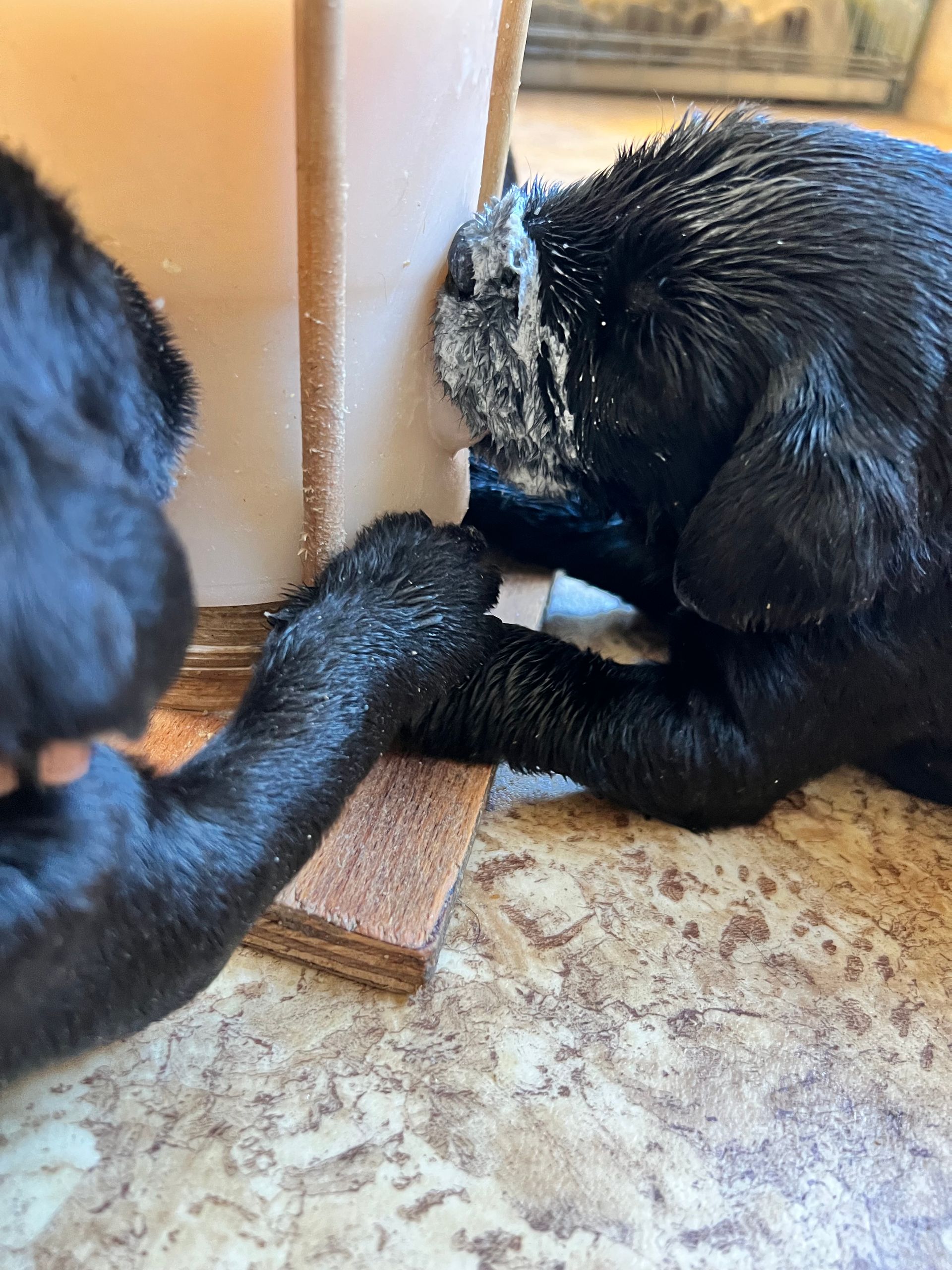 Die Welpen sind zusammen mit Negra nun aus der Wurfkiste im (provisorischem) Keller-Gästezimmer umgezogen in das Hundezimmer im Erdgeschoss. Der Umzug hat besser geklappt, als wir zu hoffen gewagt haben. Trea ist völlig entspannt! Jetzt können die Welpen anfangen ihre nächste Umgebung zu erkunden. Sie klettern schon fleißig aus dem Hundebett, riechen sofort wenn ich mit der Milch komme und werden dann ganz aufgeregt. Sie laufen schon ordentlich umher und haben gestern zum 1. mal etwas Welpenbrei geschleckt.